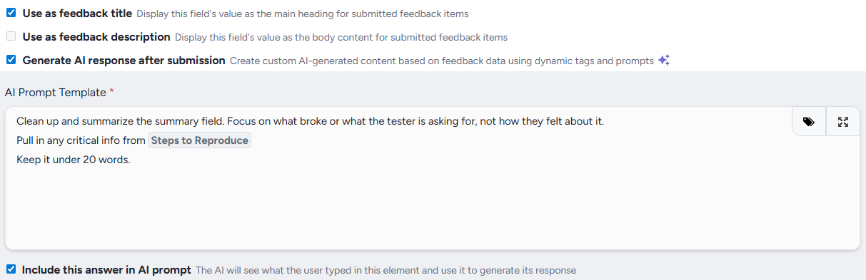 When writing your prompt, you have two tools for feeding Ted the right context. Dynamic tags let you pull in data from other fields on the form. For example, a prompt that generates a title can use a dynamic tag to reference the participant's description field, so Ted always has something concrete to work from. The Include this answer in AI prompt checkbox works differently: it tells Ted to include the current field's own value in the prompt. Use this when you want Ted to clean up or improve what the participant wrote in that field directly, no dynamic tag needed. The two work well together, but they do different things.