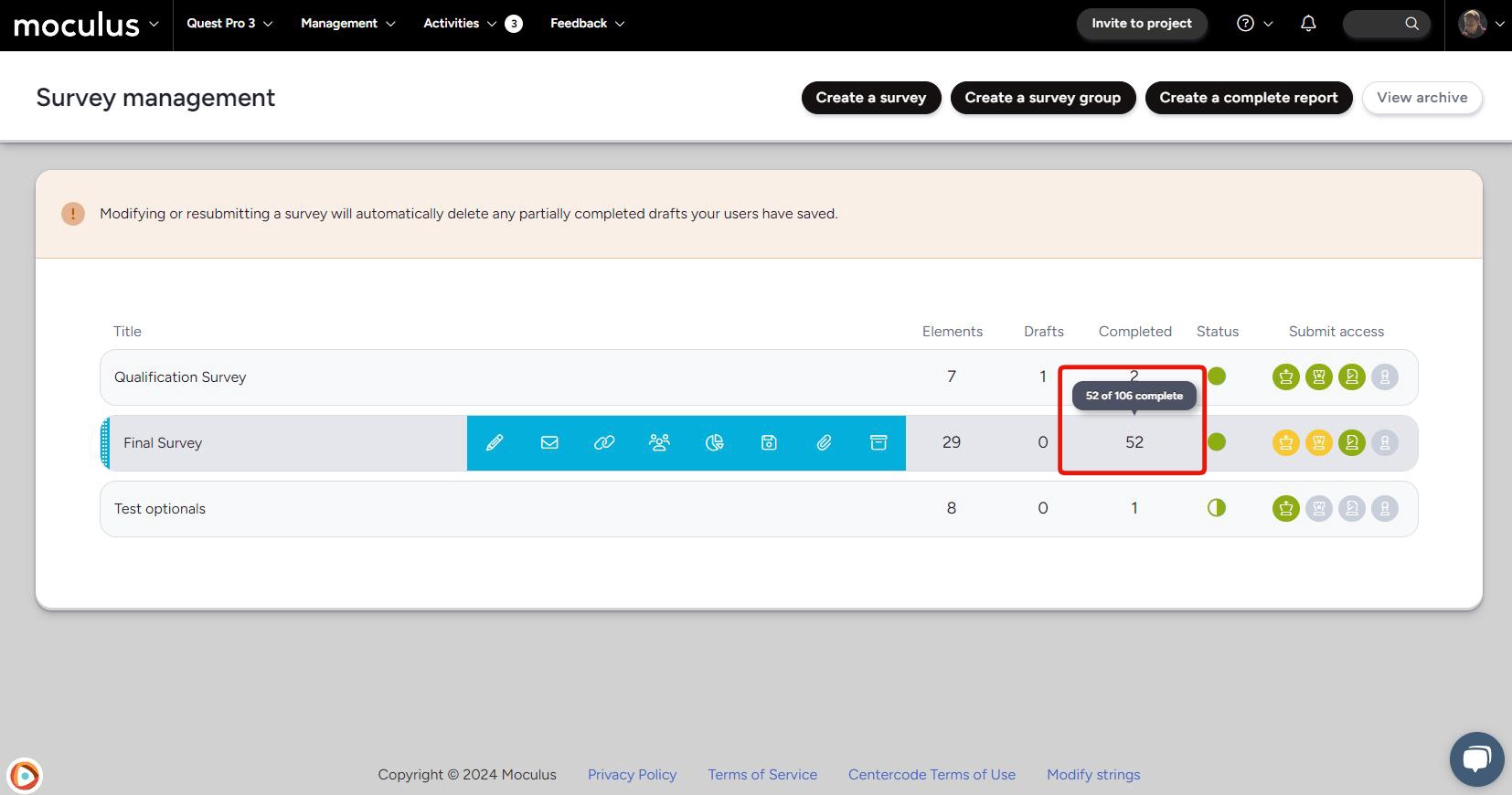 When hovering a survey, a count will display displaying completion stats