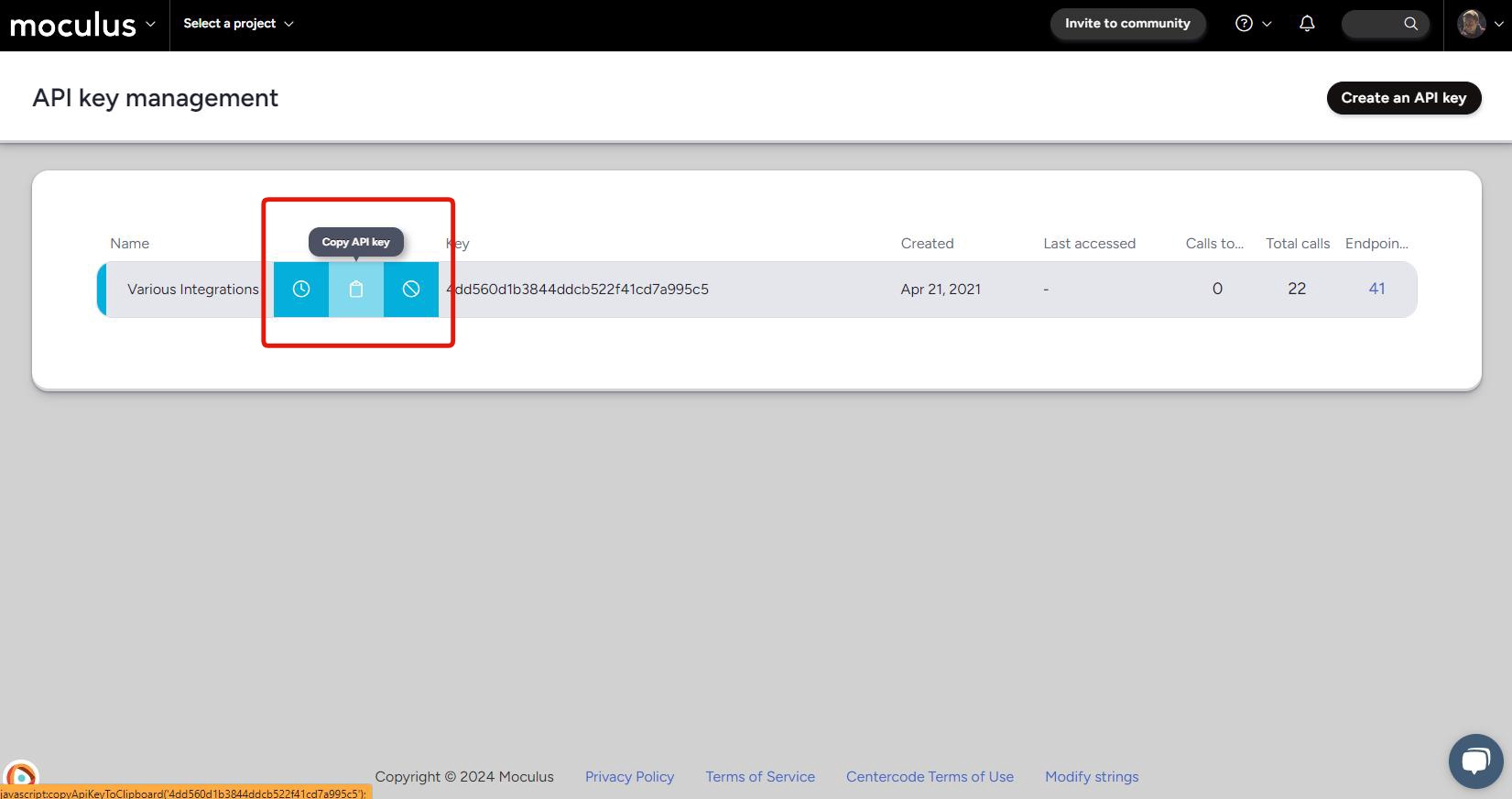 Easily copy an API key from the API key management page at the click of a button!