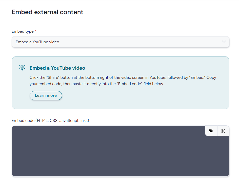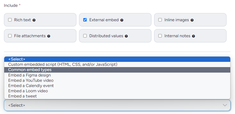 Selecting any of the pre-built embed types will present you with a helpful infobox (and accompanying linked help article), telling you how to acquire the embed code from the external source (YouTube, Loom, Figma, etc) and which field to embed the code in.