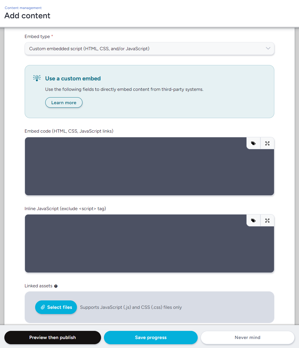 If you don't see the option you are looking for on the list, we also have a custom embedded script option that now includes the ability to include inline JavaScript and linked file assets. This custom embedding option will cover the vast majority (if not all) of proper embeds - we haven’t met one we couldn’t support!
