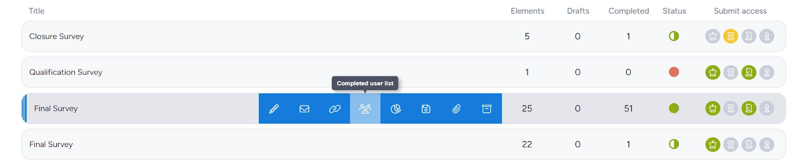 This handy new button takes you directly to a filtered user list of user accounts who have completed the survey!