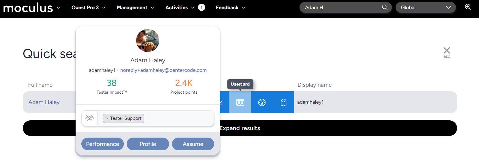 User cards are now accessible from the Quick search menu, providing access to useful data like teams, project scores, and contact information at a glance!