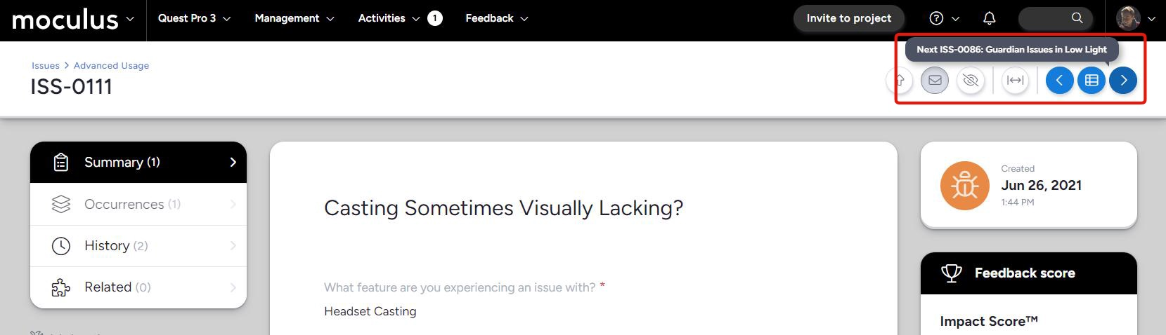Get a preview of the name and ticket number you’ll be taken to when hovering over the navigation arrows in the feedback ticket view! This way, you’ll always know which feedback is coming up next.