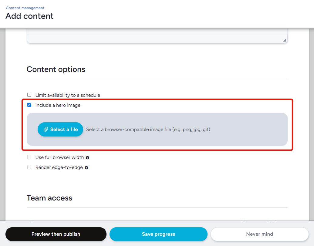 Finally, you’ll use the “Content/release/feature options” (depending on which resource you’re creating) and “Team access” sections to determine who can see your content, and when (via notices). Two new features here include the two new content options “Use full browser width” and “Render edge-to-edge (both examples featuring a new hero image!). Note: Hero Images are not compatible with the Full Browser Width option.