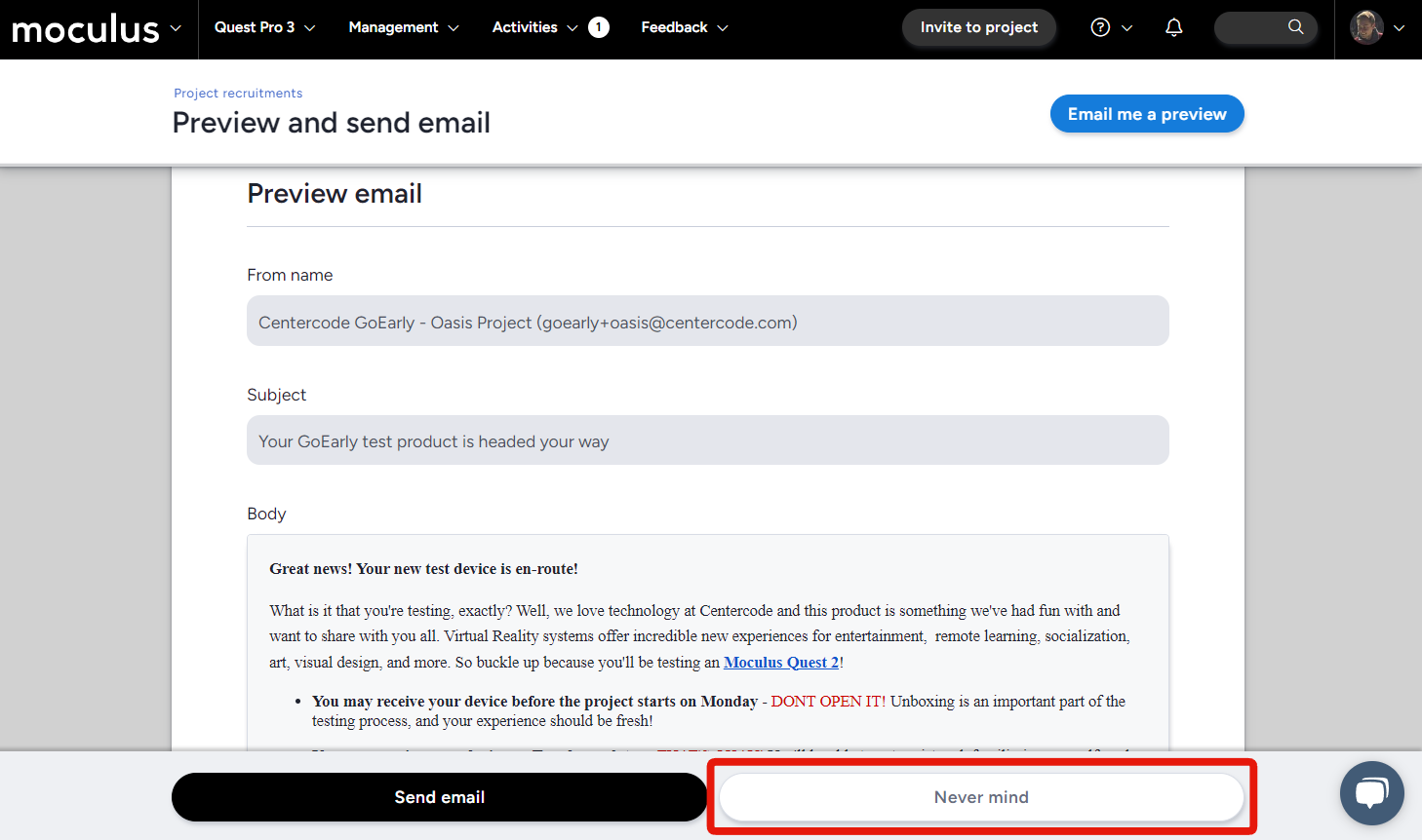 When previewing an email before sending it, the “Never mind” button will now return you to the email editing screen, allowing you to easily make last-minute changes instead of getting kicked all the way back to editing the invitation type.