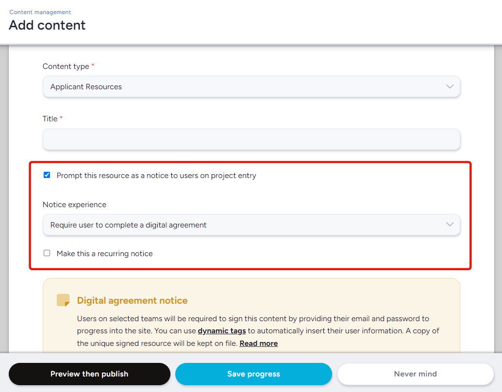 Another notable new bit of functionality here is that since you are defining whether a resource is a notice earlier in the process now, the ability to set a content or release as a notice in the “Team access” section will be dynamically enabled or disabled based on your earlier selections!