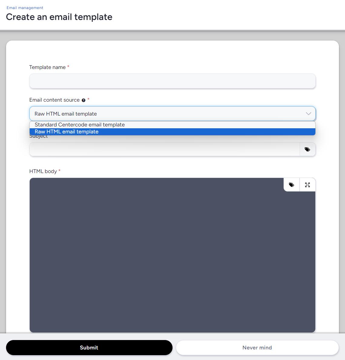 And lastly, we’ve added the option to input fully custom emails into templates via raw HTML, which will completely bypass Centercode’s normal email validation. This ensures that the exact source you paste will be exactly what is delivered to your users. To use this new feature, simply select “Raw HTML email template” from the new “Email content source” dropdown when creating an email template.