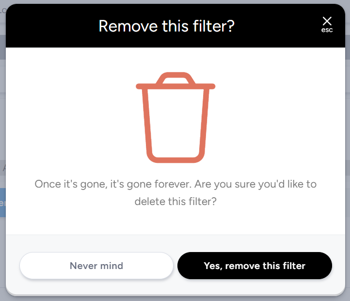 This new confirmation window for the “Remove Filter/View” button ensures that a misclick doesn’t lead to accidentally removing a valuable resource.