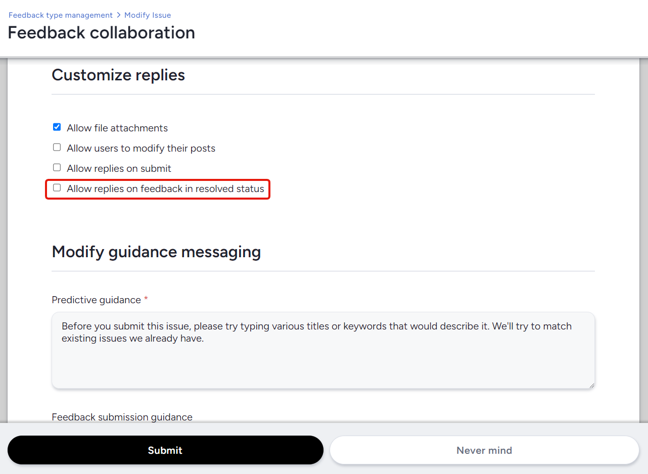 This new option will allow new replies on closed feedback so discussion can continue on feedback you have marked as resolved. This gives you more flexibility in how you use resolved statuses.