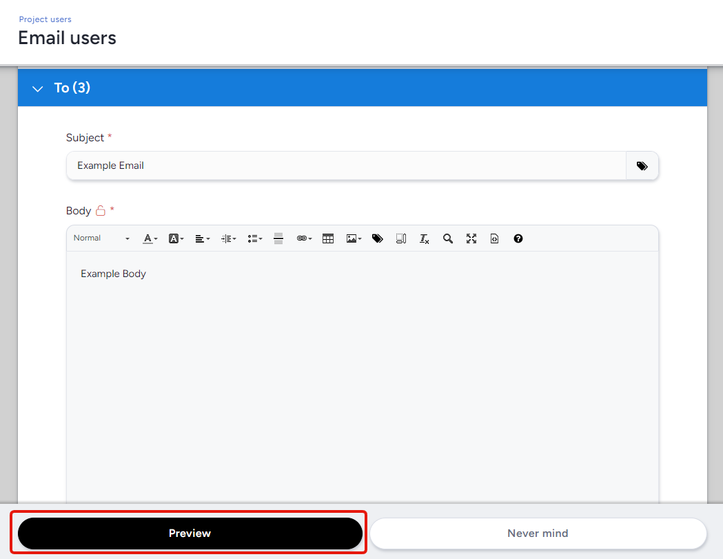 The updated button text makes it clearer that you’ll proceed to a typical “preview” step before finalizing the email being sent.
