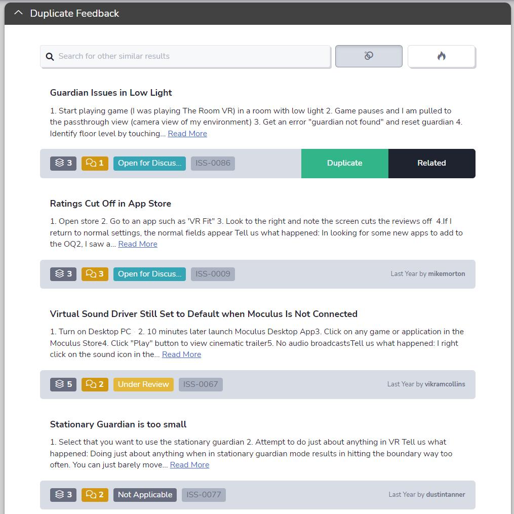 Next in line are some improvements to our Feedback Duplicate and Predictive Match interface. Like the Feedback Reply UI, we've switched the Duplicate Feedback and Predictive Match interface to a single clean and contiguous window (#twinsies). The adjusted button width ensures your ticket information on the left side of the bar won't get covered. We've finished it off with visual polish here and there, including updated colors, icons, and brand new tooltips for each icon.