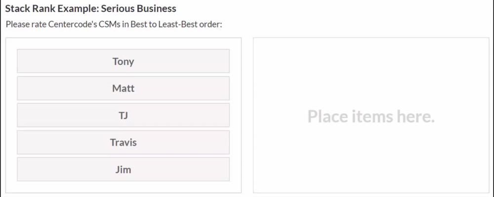 - With too many items to order, respondents typically only focus on tops and bottoms, meaning your “middle” rankings blur together, quickly losing their value. Avoid having more than about 7 items per stack.