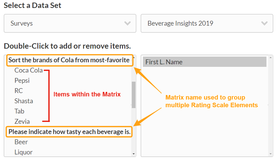 Also, note that since Matrices and Stacks consist of multiple Rating Scales, the Rating Scale option is still available when selecting individual data items.
