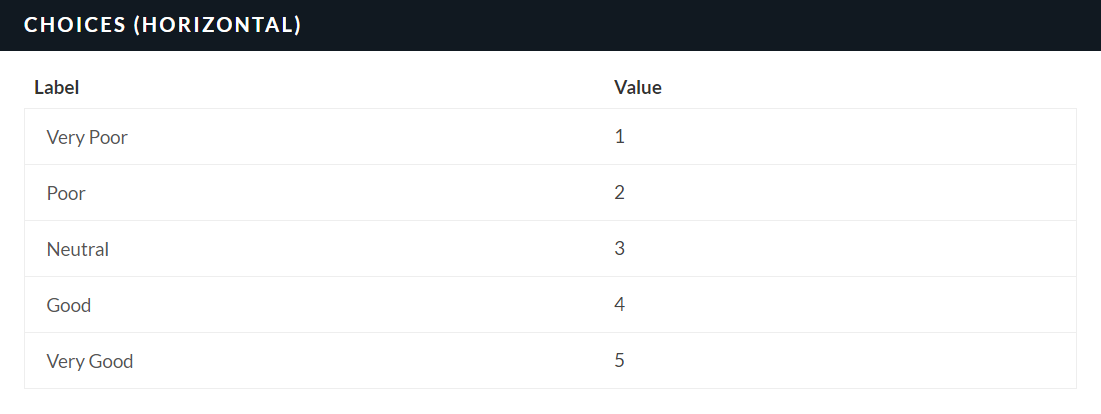 Matrix Elements come as a dedicated element type in the Form Engine, giving you a full set of configuration options. You’ll set the Choices (column labels which default to 1 - 5) as well as the Items being rated (the rows); making configuring a Matrix Element flexible and intuitive. Like all our similar form elements, Choices and Items also allow for a front-end Label and internal Value so you can present something tester-facing on the form, but report the results in a language your stakeholders, data analysts, or integrated tools can easily understand.