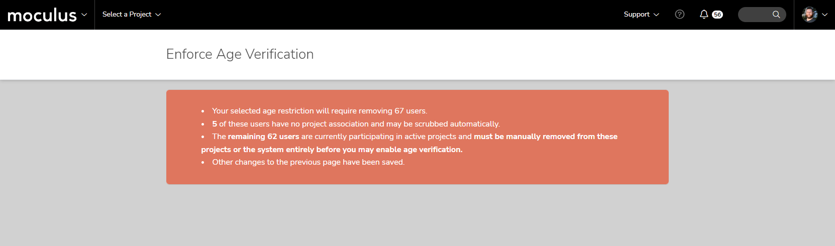 This kicks off two awesome functions. First, it will automatically prevent new underaged users from creating accounts. Second, it will scrub your entire community for date-of-birth data (or collect it if none is available) and present a number of different options for removing existing users who do not meet your criteria.
