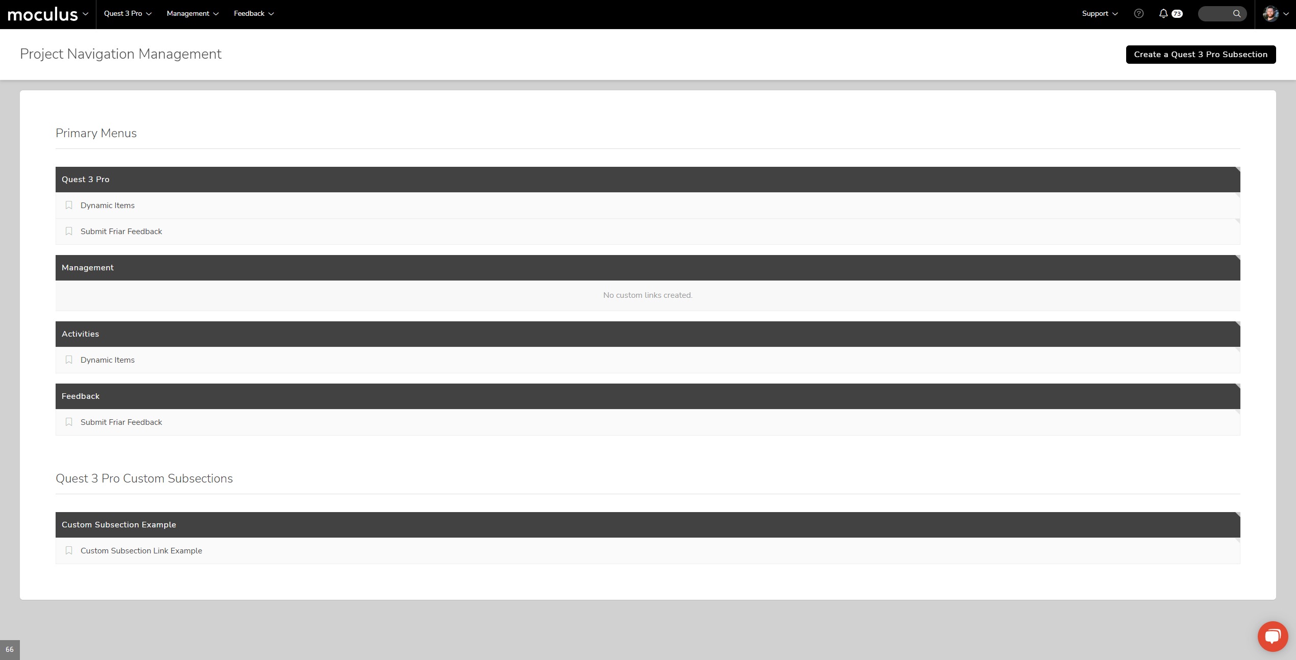 Customizing your Project menus is easier than ever with updates to the Project Navigation Menu UI. The new Project Navigation Management menu keeps the standard Menus (Project Menu, Management, Activities, Feedback) right where you expect them in the Primary Menus category, and gives you the ability to create custom Project Menu subsections for deeper organization of menu links.