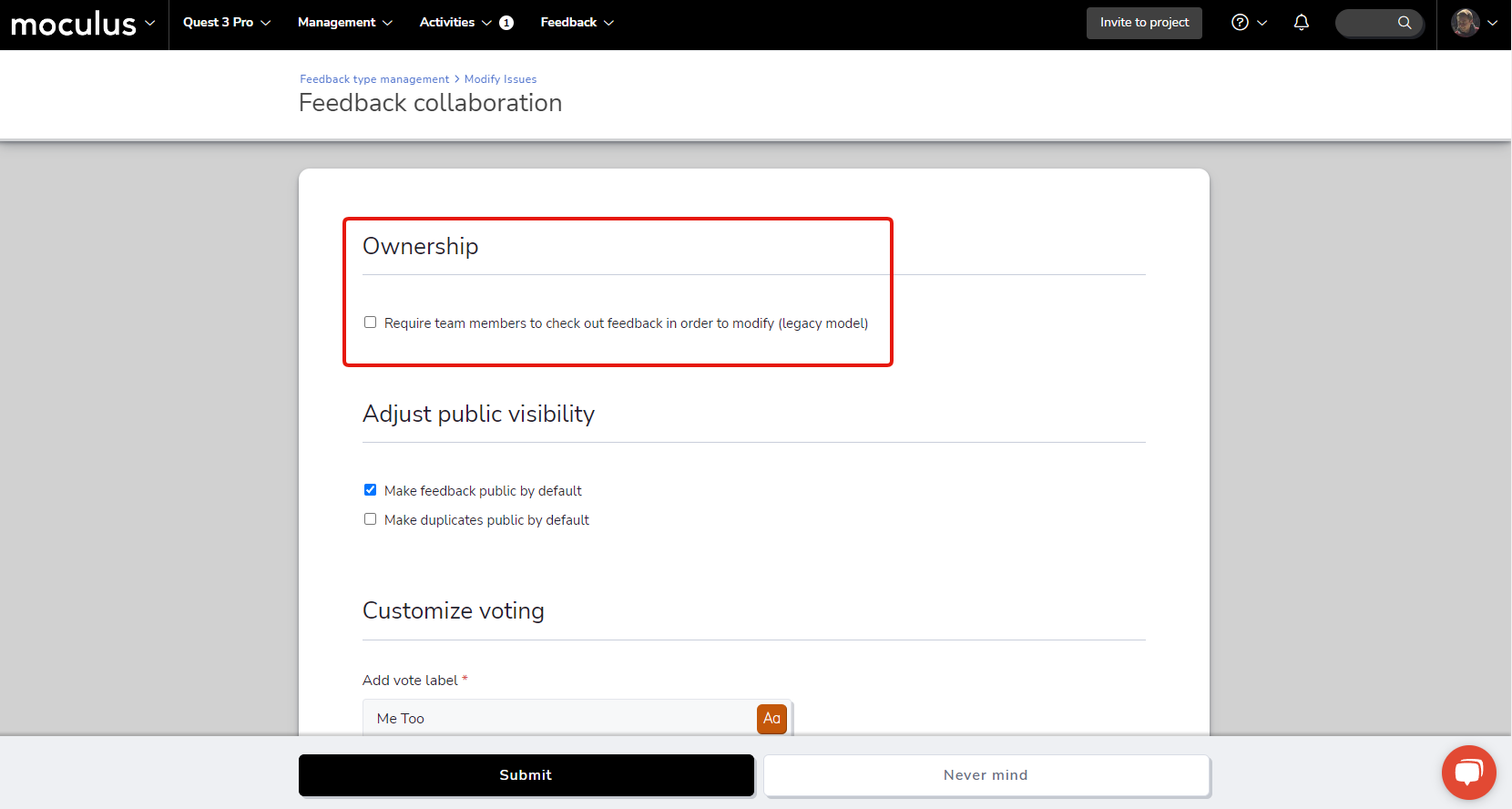 Sticking with the trend of streamlining the feedback triage process, we’ve got an (optional!) simplification that removes the need to take ownership of (or “check out”) a ticket before making edits. We’ve added an ownership section to the top of the Feedback collaboration settings menu within each feedback type, which contains the new checkbox “Require team members to check out feedback in order to modify”. Leaving this box unchecked means that any user who is a member of the feedback owner team can make edits at will, without taking direct ownership of the ticket!