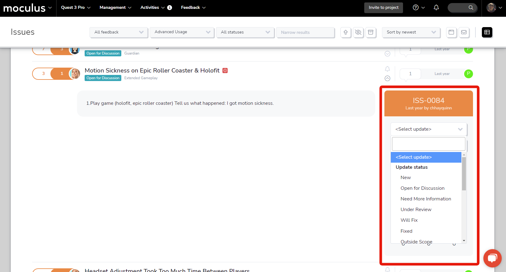 To access this new functionality, simply open the expanded view of any feedback ticket card, and click the new Quick update hyperlink. This link will present you with a drop-down list of a huge variety of actions, including status updates, macros, and even the new feedback conversion tool mentioned above! You'll also be able to quickly reply to a ticket from the card itself (both as a single action or in addition to one of the previously mentioned actions). We love giving you solutions that increase functionality and reduce friction at the same time!
