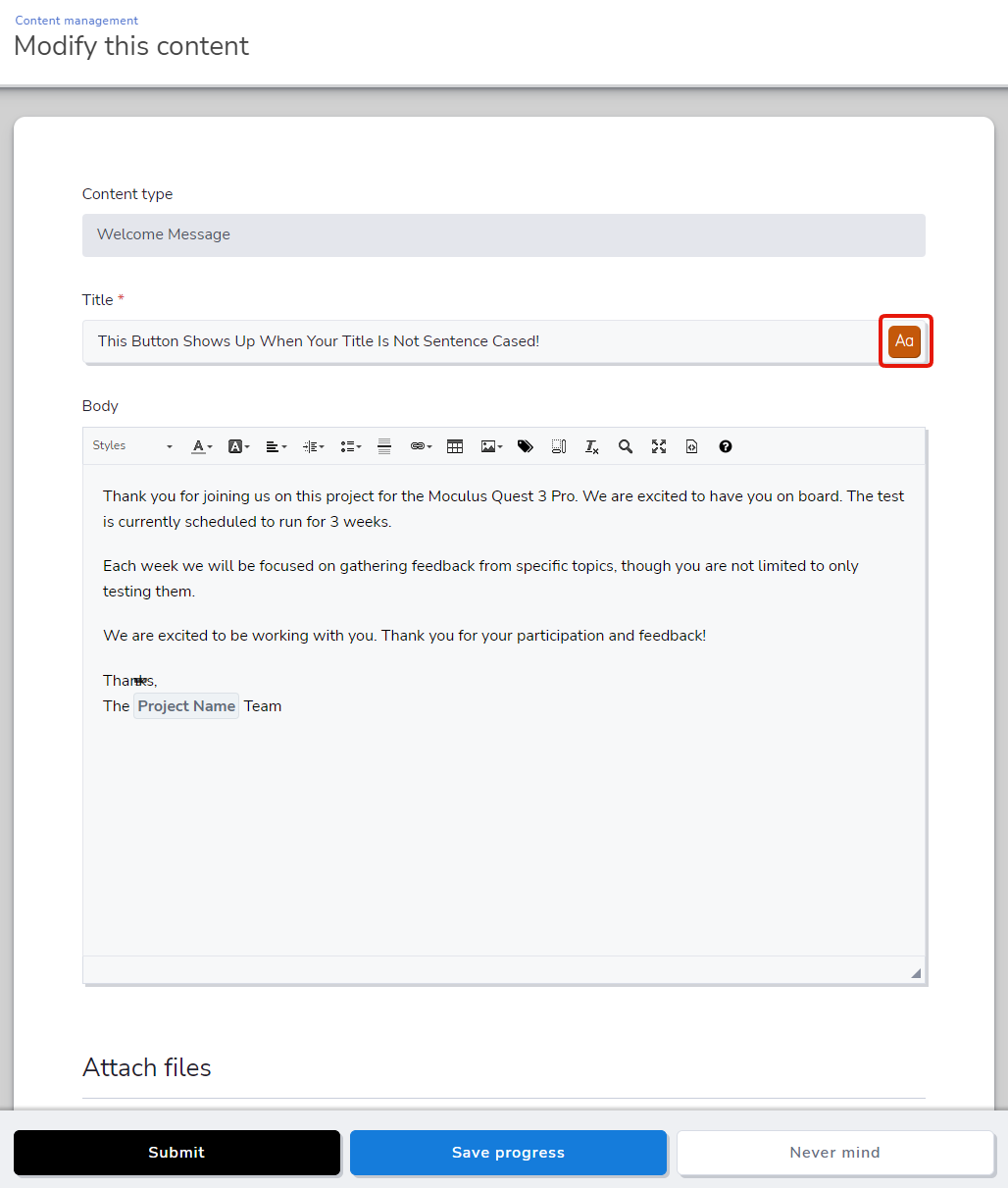Connected to the sentence case update, we've added a nifty little feature that makes sentence casing feedback summaries and other title fields refreshingly simple. The Case Tool button appears on the right edge of a title or name field when it detects a capitalized word in the middle of a phrase. Clicking this button automatically sentence cases the text inside—meaning you no longer need to install a Chrome extension or wear out your eyes manually casing word after word. In addition to recognizing ALL CAPS as acronyms, it recognizes your company name, community name, and project name as proper nouns and keeps them appropriately capitalized.