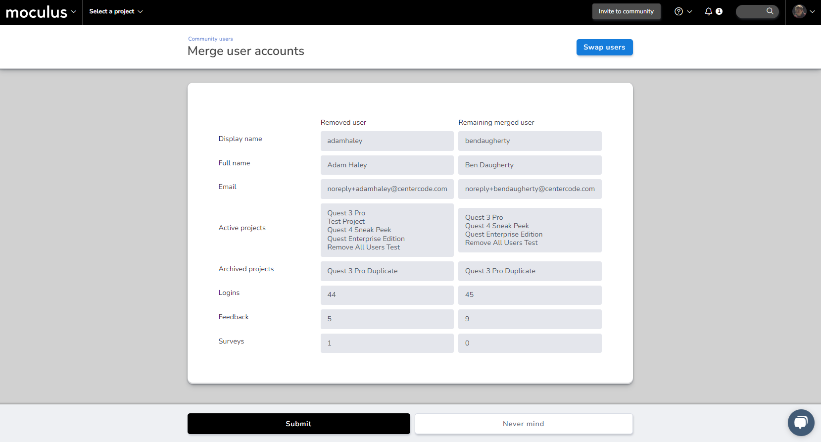 Next up, we’ve got a visual refresh for our Merge User Accounts tool. The Merge User Accounts tool received a bit of visual polish to bring it in line with the more modern look of the platform, and we’ve tweaked the data displayed about the user accounts you're merging to more accurately reflect the data community managers are concerned about when merging accounts.