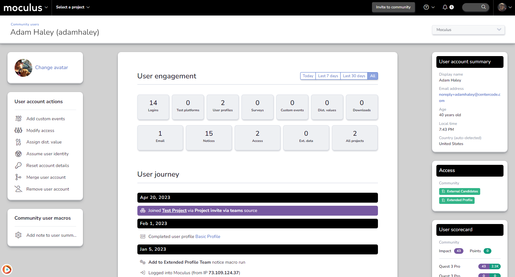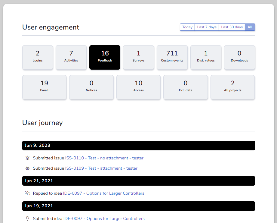 The next major improvement to the User Summary interface comes in the form of the new User Journey tool. User journey tracks and displays a huge amount of data about events and activities performed by (or on) your users. Even better, the presentation of this information is now standardized across the community and project scopes. The same community/project selection drop-down menu that lets you switch between scopes also gives you access to the information presented by the User journey, swapping dynamically based on the scope you're viewing. Finally, a series of clickable cards above the User journey will allow you to filter for the exact data you’re looking for, also updating dynamically based on your scope and the time period filter selected.