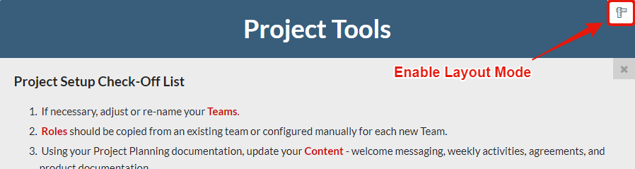 To resolve this potential challenge, we’ve added a button to the Layout Mode interface, allowing anyone with Project Tools access to re-open their Project Template Message if they’ve happened to close it.