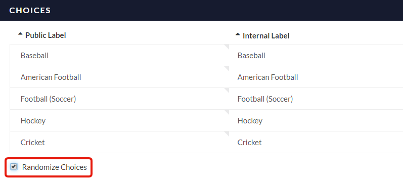 - In addition to sorting via deliberate drag-and-drop, you can use the Internal Label field, you can apply your own unique Ascending or Descending sort based on Choice Labels that are hidden from the respondent. This is easiest when adding choices en masse via copy-paste (note the pipe: Choice1|Label1).